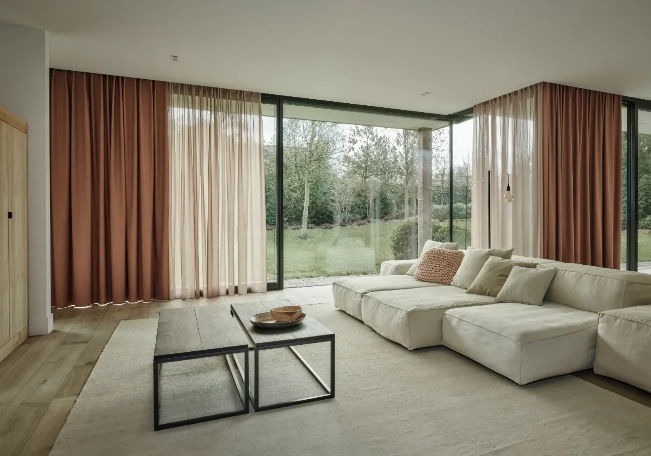Een klassieker die nog altijd populair is: vitrages met overgordijnen. De vitrage laat overdag zacht licht door, maar voorkomt ongewenste inkijk, zodat je altijd van je privacy kunt genieten. ’s Avonds sluit je de dikkere gordijnen voor extra privacy, verduistering én isolatie. Deze combinatie werkt perfect in woonkamers en slaapkamers waar je de sfeer en lichtinval wilt kunnen aanpassen aan het moment van de dag. Kies voor gevoerde overgordijnen als je extra warmte en geluidsdemping zoekt. Zo combineer je comfort en stijl, zonder concessies te doen aan de lichtinval overdag.